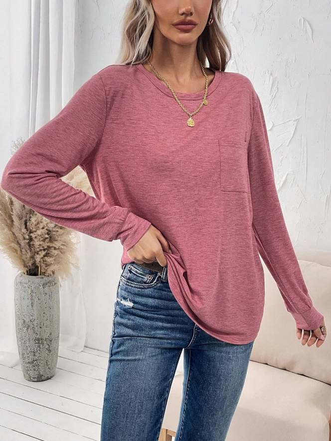Camiseta femenina de estilo casual, con diseño suelto y acabado liso en tono rosa. Confeccionada en tela de estiramiento medio, incluye cuello scoop, manga larga con hombros caídos y bolsillo decorativo. Ideal para looks relajados, uso diario o capas ligeras.