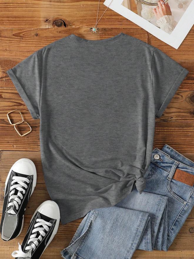 Camiseta femenina de estilo casual, con diseño regular y estampado gráfico floral en tonos vibrantes sobre fondo gris oscuro. Confeccionada en tela de elasticidad ligera, incluye cuello redondo, manga corta y corte cómodo para uso diario o en casa.