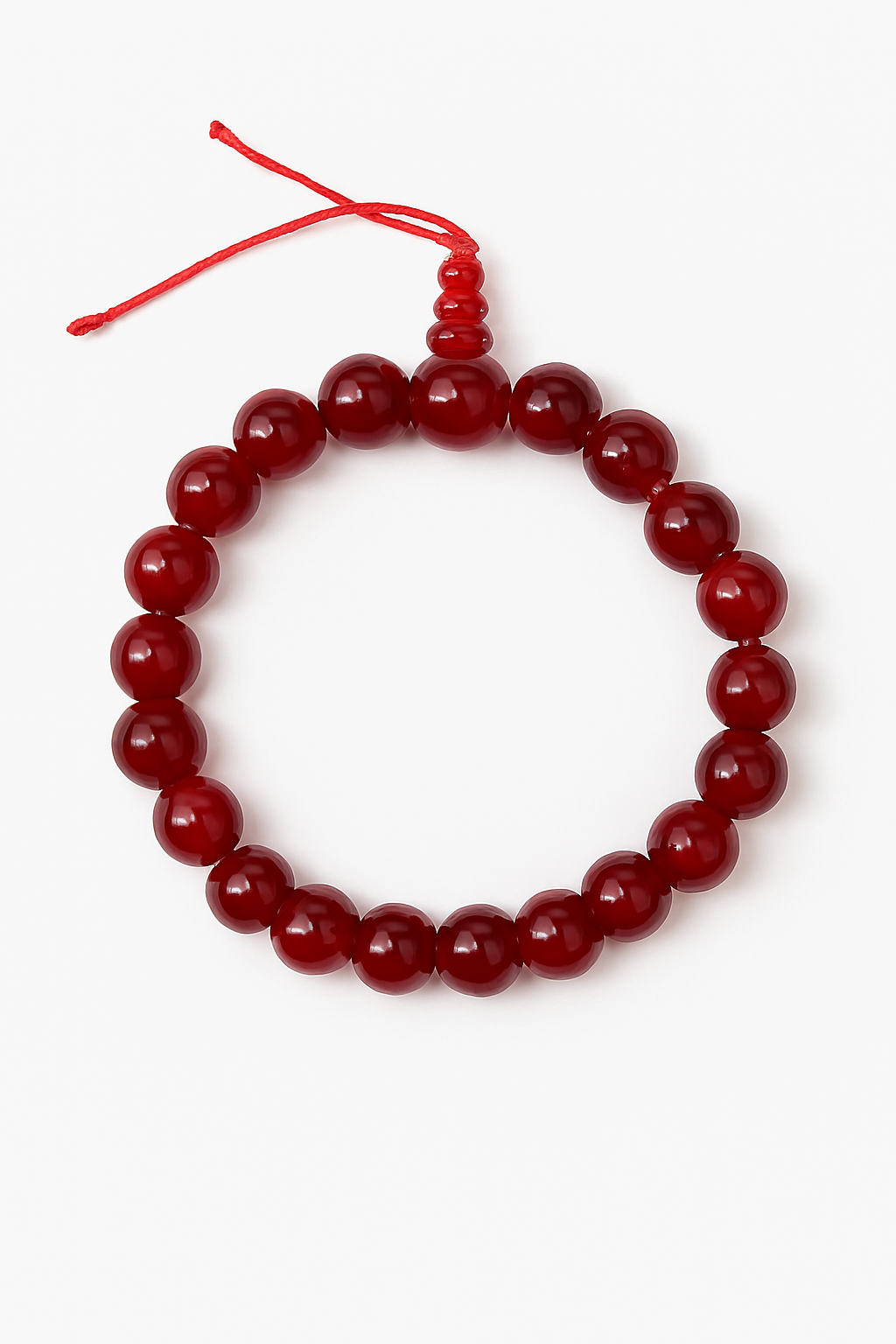 Brazalete femenino compuesto por cuentas esféricas de vidrio rojo, ideal para regalar o usar como accesorio diario con intención. Su diseño incluye un cierre decorativo con cuentas pequeñas y cordón rojo trenzado, aportando un toque artesanal y simbólico.