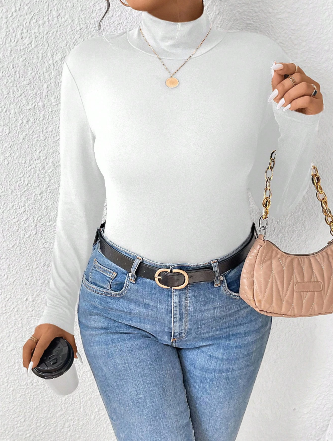 🤍 Camiseta de Manga Larga Ajustada con Cuello de Pie de Unicolor