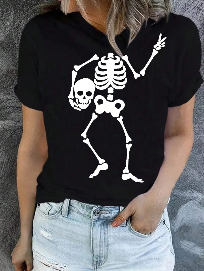 Camiseta femenina de estilo casual, con diseño normal y gráfico de esqueleto en pose divertida. Ideal para el Día de los Muertos, Halloween o como pieza gráfica para looks relajados. Confeccionada en tela suave con elasticidad ligera.