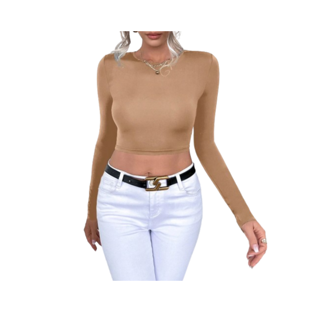 Camiseta femenina de estilo casual, con diseño crop y ajuste regular. Confeccionada en tela tricotada de alta elasticidad, incluye manga larga, cuello redondo y acabado canalé en tono camel. Ideal para looks diarios con estructura y comodidad.
