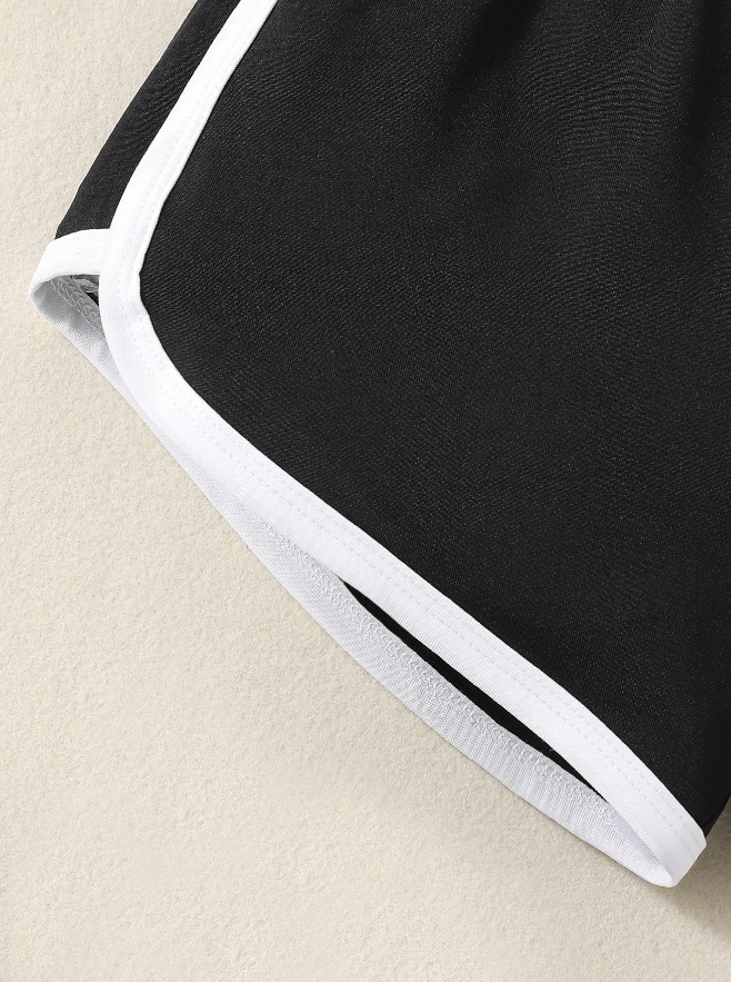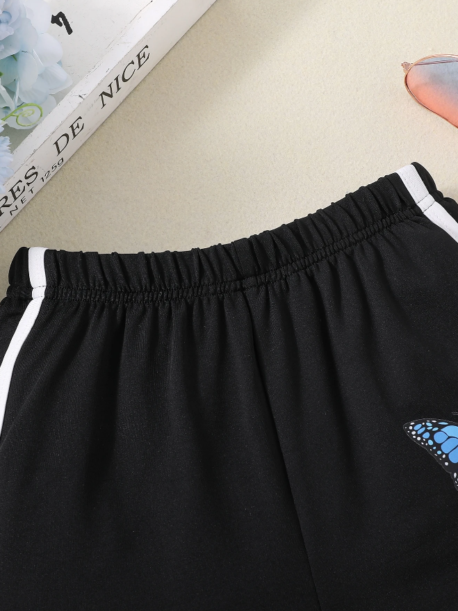 Diseñados para niñas activas que no renuncian al estilo. Estos shorts negros presentan un estampado de mariposa azul en la pierna derecha y líneas blancas en contraste que enmarcan el diseño con un toque moderno y deportivo.